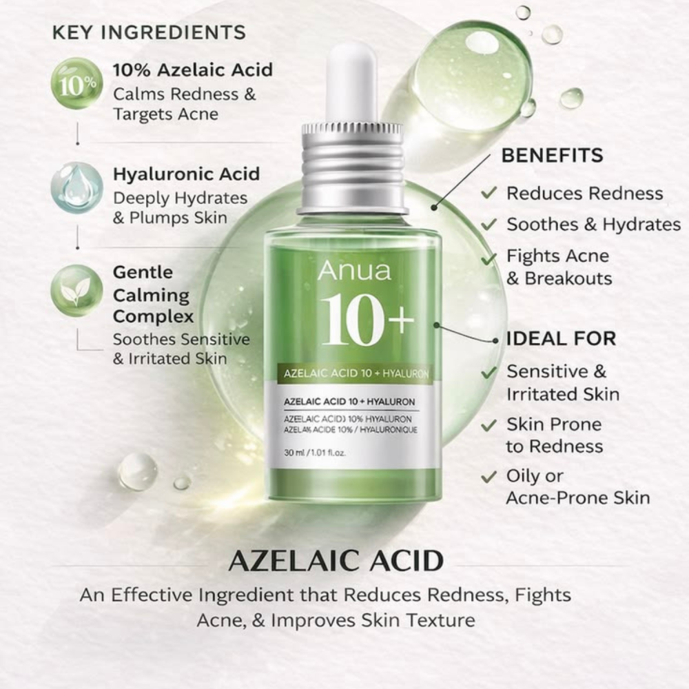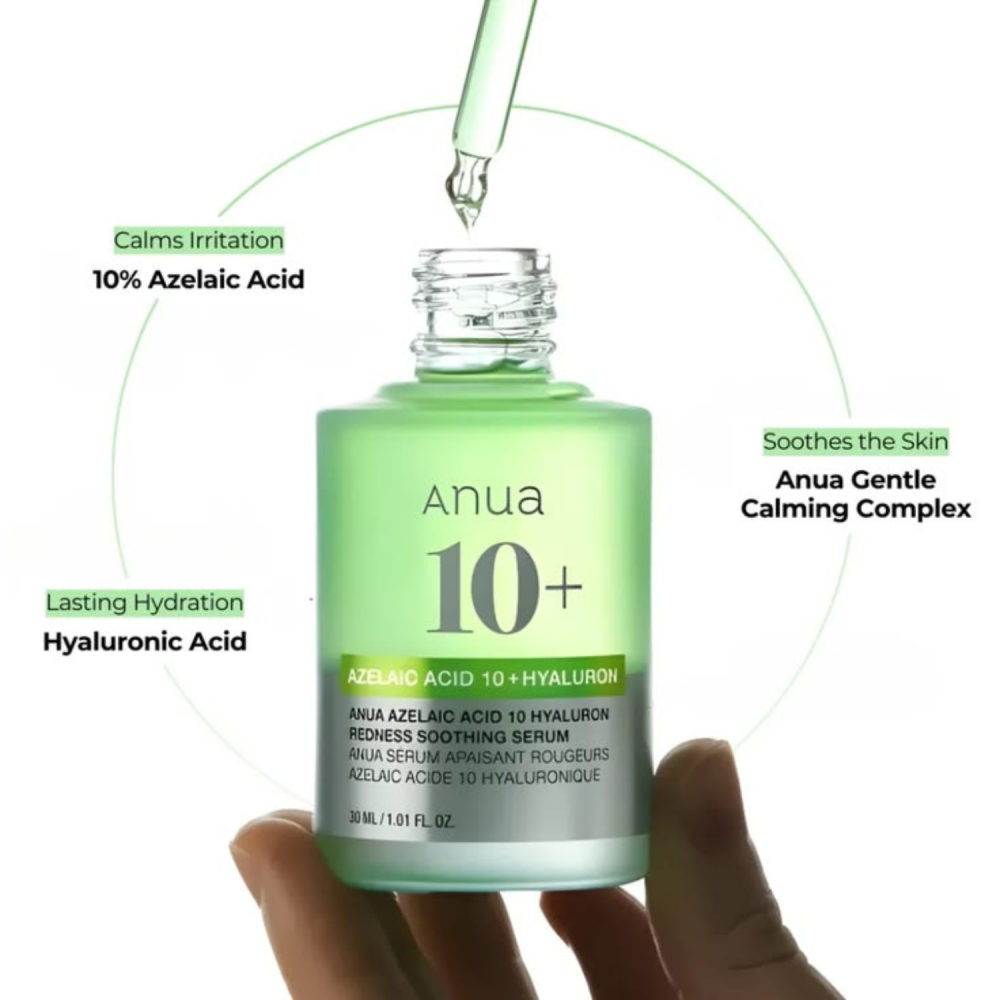 Anua Azelaic Acid 10 Hyaluron Redness Soothing Serum è un siero viso leggero studiato per calmare la pelle arrossata e irritata, migliorare la texture e uniformare il tono dell’incarnato. Formulato con il 10% di acido azelaico, aiuta a contrastare acne, rossori e discromie, svolgendo un’azione antibatterica e riequilibrante che contribuisce a mantenere la pelle più pulita e uniforme. Il complesso di acido ialuronico assicura un’idratazione profonda e duratura, lasciando la pelle morbida, rimpolpata e luminosa senza appesantire. La formula è arricchita con ingredienti lenitivi come Centella Asiatica, aloe vera e acqua di tè verde, che lavorano in sinergia per calmare le irritazioni e rafforzare la barriera cutanea. La presenza di niacinamide aiuta a migliorare la luminosità e a minimizzare i pori, mentre attivi come pantenolo e allantoina donano comfort immediato anche alle pelli più sensibili. Il suo caratteristico colore verde deriva dal Gentle Calming Complex™, una combinazione di ingredienti naturali ad azione calmante. Grazie alla sua texture leggera e non comedogenica, è ideale per l’uso quotidiano anche su pelle sensibile, acneica o soggetta a rossori.