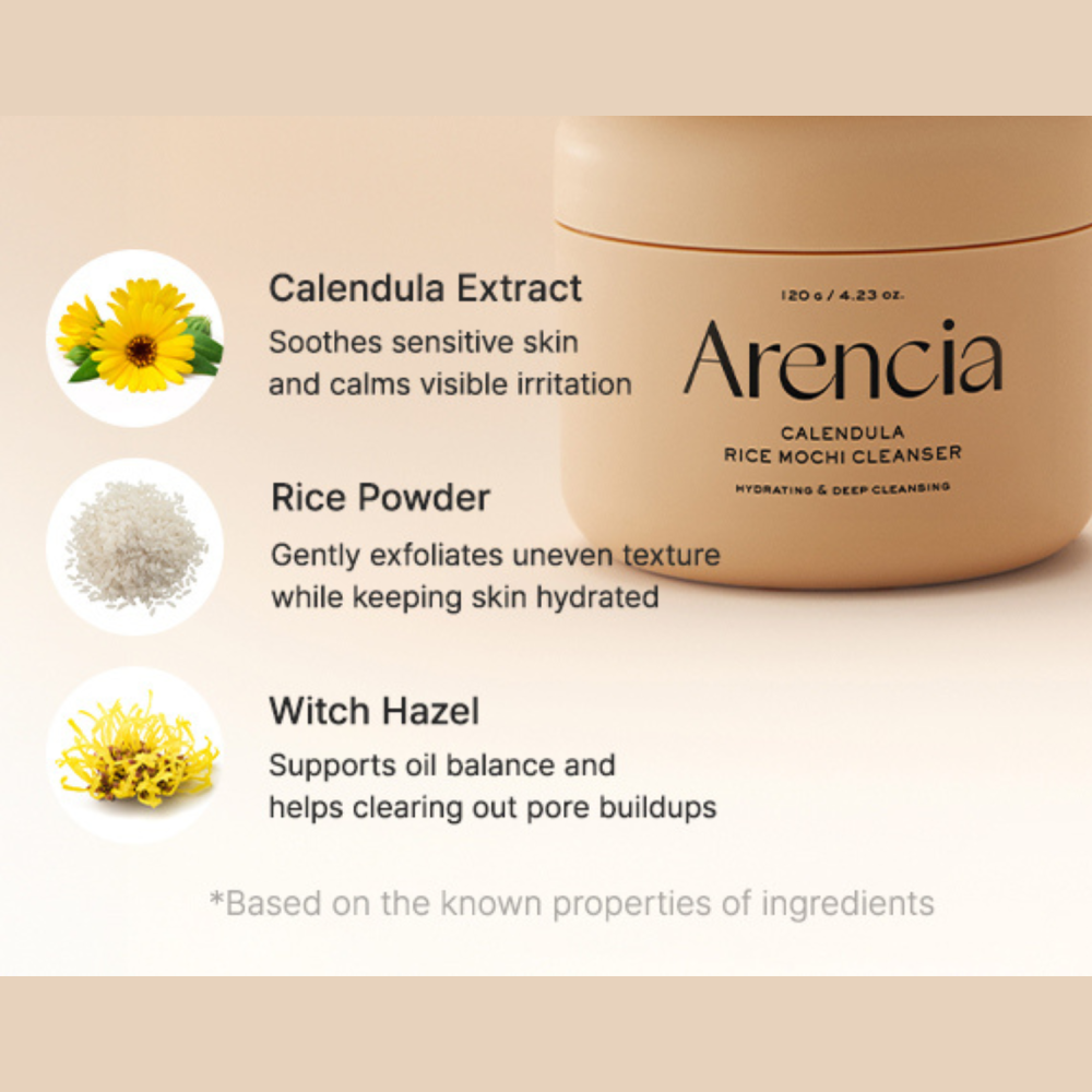 Calendula Rice Mochi Cleanser di Arencia è un detergente viso 3-in-1 ideale per le pelli sensibili, che combina in un unico prodotto l’efficacia di un detergente, uno scrub delicato e uno struccante. Arricchito con oltre 34 ingredienti naturali, tra cui estratti di calendula, houttuynia e fico d’India, nutre e lenisce la pelle fornendo idratazione e protezione. L’estratto di calendula, ricco di vitamina C e flavonoidi, aiuta a calmare le irritazioni, migliorare la luminosità e rafforzare la barriera cutanea. La sua esclusiva texture “rice cake” a base di polvere di riso e mandorla dolce elimina delicatamente le impurità e le cellule morte senza seccare la pelle. Dopo ogni utilizzo, il viso risulta morbido, levigato e perfettamente pulito.