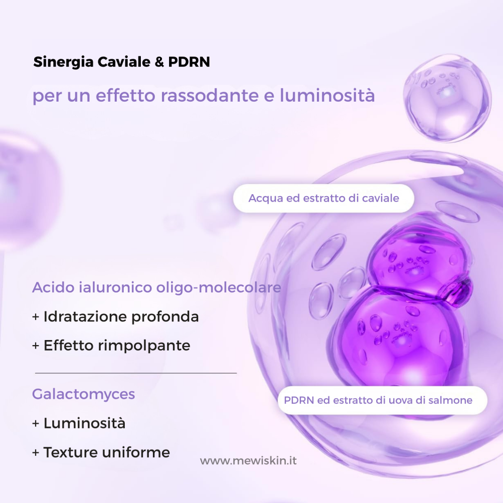 La formula combina estratto di caviale, ricco di nutrienti e aminoacidi, con PDRN (Polydeoxyribonucleotide), un attivo noto per stimolare la rigenerazione cellulare e migliorare la compattezza cutanea. Questa sinergia aiuta a rafforzare la barriera della pelle, levigare le rughe e restituire un aspetto più tonico e uniforme.