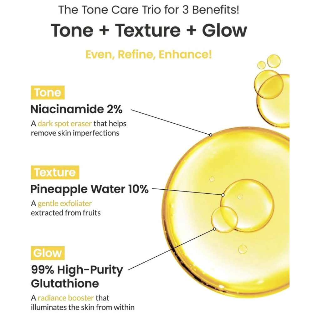 Aqua, Ananas Sativus (Pineapple) Fruit Water (100,000ppm), Glycerin, Acrylates Copolymer, Niacinamide (20,000ppm), 1,2-Hexanediol, Ceratonia Siliqua (Carob) Gum, Betaine, Chondrus Crispus, Polyglyceryl-10 Laurate, Potassium Chloride, Sucrose, Polyglyceryl-2 Triisostearate, Allantoin, Agar, Cellulose Gum, Ethylhexylglycerin, Butylene Glycol, Adenosine, Pyrus Communis (Pear) Fruit Extract, Sclerotium Gum, Disodium EDTA, Rosa Damascena Flower Water, Melia Azadirachta Leaf Extract, Melia Azadirachta Flower Extract, Iris Florentina Root Extract, Ananas Sativus (Pineapple) Fruit Extract, Hippophae Rhamnoides Oil, Cucumis Melo (Melon) Fruit Extract, Curcuma Longa (Turmeric) Root Extract, Hedera Helix (Ivy) Leaf/Stem Extract, Ocimum Sanctum Leaf Extract, Corallina Officinalis Extract, Tocopherol, Sodium Hyaluronate, Hydrolyzed Hyaluronic Acid, Gluconolactone, Boron Nitride, Caprylyl Glycol, Hydroxypropyltrimonium Hyaluronate, Glutathione, Sodium Acetylated Hyaluronate, Hyaluronic Acid, Hydrolyzed Sodium Hyaluronate, Sodium Hyaluronate Crosspolymer, Potassium Hyaluronate