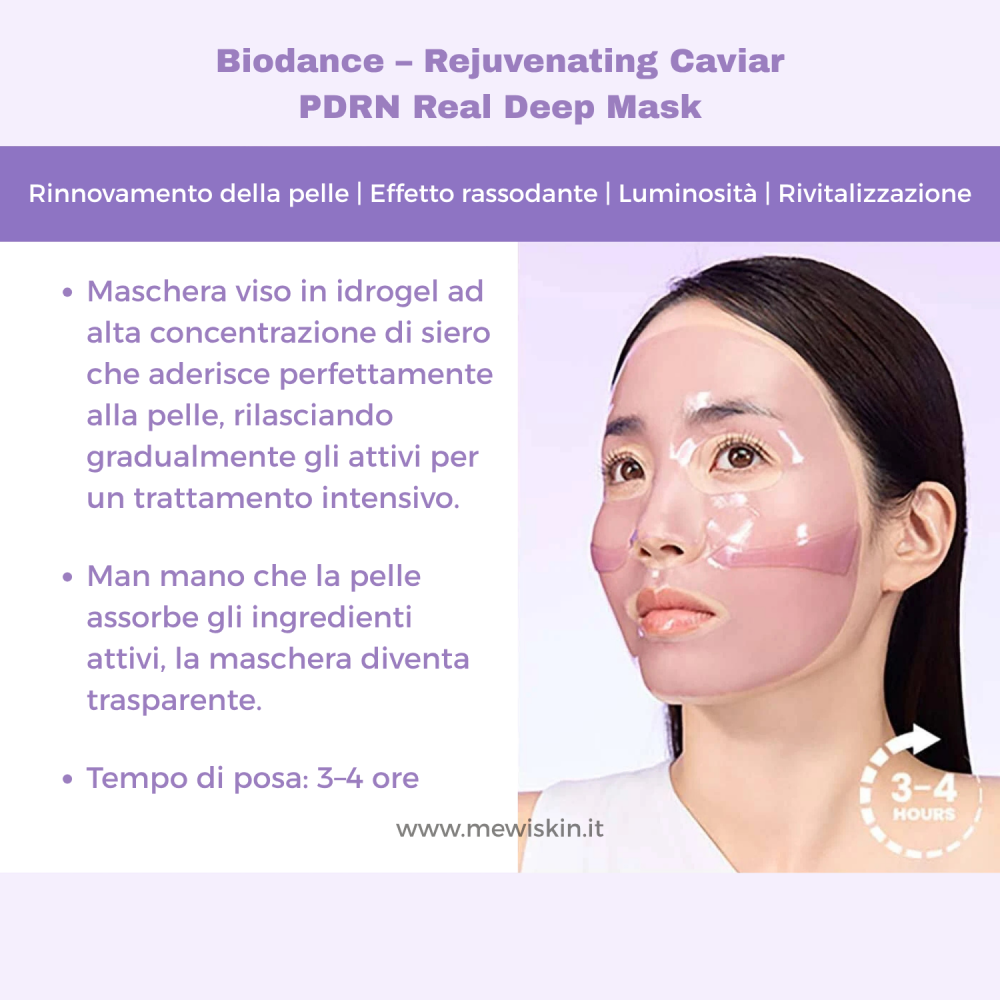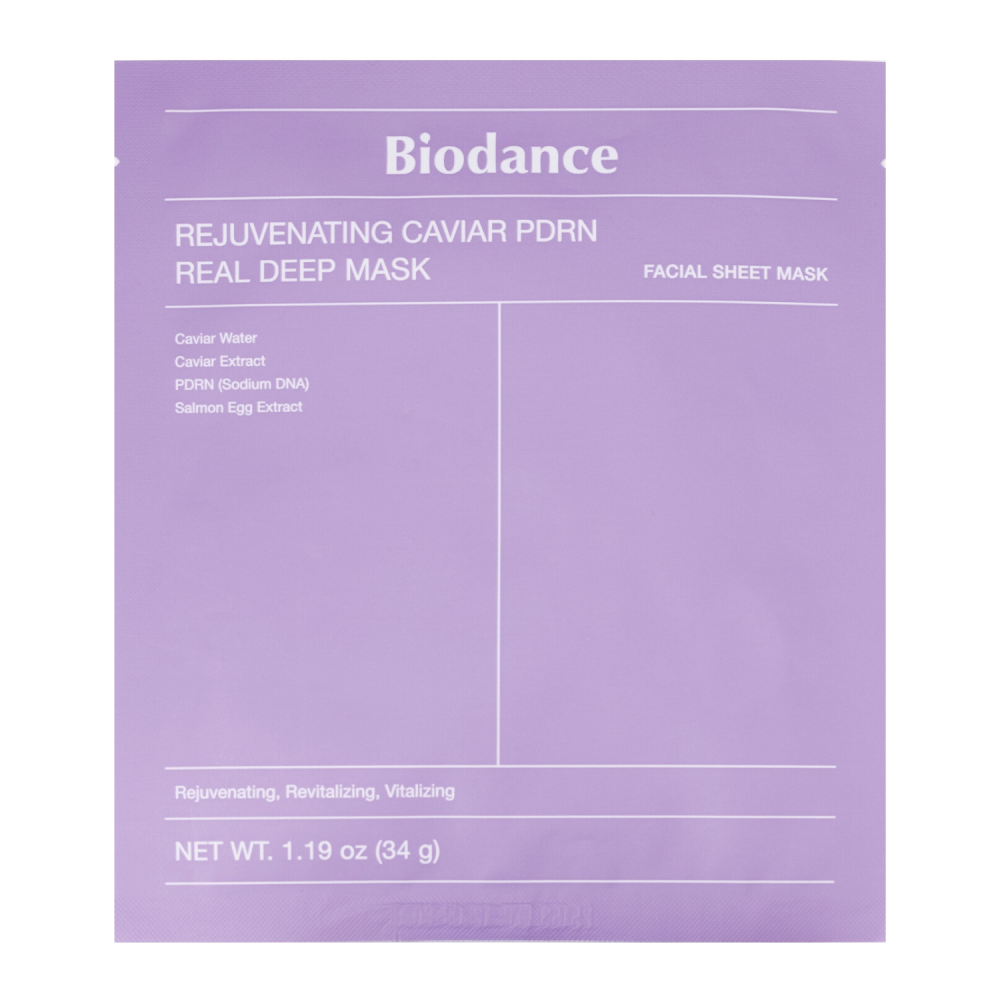 Biodance Rejuvenating Caviar PDRN Real Deep Mask è una maschera viso in hydrogel altamente nutriente formulata per rigenerare la pelle e migliorarne visibilmente elasticità e compattezza. Arricchita con estratto di caviale, ricco di nutrienti, aminoacidi e minerali, aiuta a nutrire intensamente la pelle e a restituirle un aspetto più sano e vitale. Il PDRN (Polydeoxyribonucleotide) supporta i processi di rigenerazione cutanea, favorendo il recupero della pelle e migliorando la sua elasticità nel tempo. La formula è completata da ingredienti idratanti e lenitivi che apportano un’idratazione profonda, lasciando la pelle morbida, rimpolpata e luminosa. Grazie ai componenti che rafforzano la barriera cutanea, la pelle risulta più resistente agli agenti esterni e visibilmente più equilibrata. Dopo l’utilizzo, l’incarnato appare più uniforme, levigato e radioso. Ideale come trattamento intensivo per pelli stanche, spente o disidratate.
