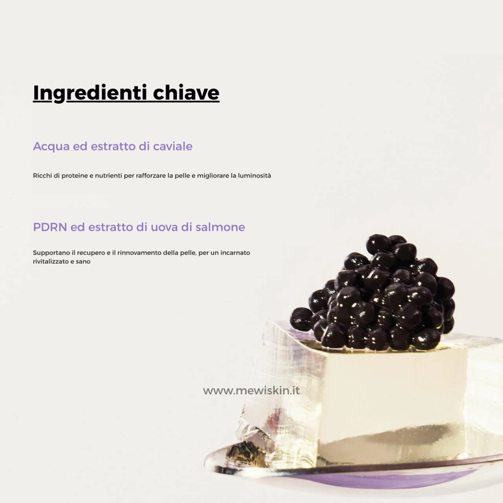 Ingredienti (INCI): Caviar Water, Aqua, Glycerin, Dipropylene Glycol, Cetyl Ethylhexanoate, 1,2-Hexanediol, Niacinamide, Propylene Glycol Dibenzoate, Chondrus Crispus Extract, Ceratonia Siliqua (Carob) Gum, Butyrospermum Parkii (Shea) Butter, Hydroxyacetophenone, Polyglyceryl-3 Methylglucose Distearate, Potassium Chloride, Algin, Chondrus Crispus Powder, Polyacrylate-13, Allantoin, Glyceryl Stearate, Cellulose Gum, Glucomannan, Xanthan Gum, Ethylhexyl Olivate, Eclipta Prostrata Extract, Sucrose, Ethylhexylglycerin, Hydrogenated Polyisobutene, Sodium Acrylates Copolymer, Sodium Polyacryloyldimethyl Taurate, Adenosine, Melia Azadirachta Leaf Extract, Sodium Phytate, Polyglyceryl-4 Oleate, Polyglyceryl-10 Laurate, Ethylhexyl Palmitate, Melia Azadirachta Flower Extract, Pyrus Communis (Pear) Fruit Extract, Sorbitan Isostearate, Rosa Damascena Flower Water, Sodium Polyacrylate, Coccinia Indica Fruit Extract, Caviar Extract, Salmon Egg Extract, Iris Florentina Root Extract, Cucumis Melo (Melon) Fruit Extract, Moringa Oleifera Seed Oil, Hedera Helix (Ivy) Leaf/Stem Extract, Solanum Melongena (Eggplant) Fruit Extract, Aloe Barbadensis Flower Extract, Simmondsia Chinensis (Jojoba) Seed Oil, Ocimum Sanctum Leaf Extract, Curcuma Longa (Turmeric) Root Extract, Corallina Officinalis Extract, Tocopherol, Sodium DNA.