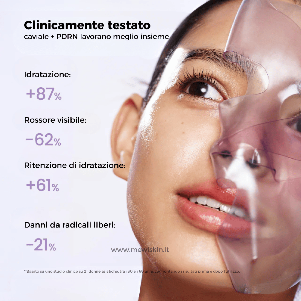 Maschera viso in hydrogel intensiva con caviale e PDRN che nutre in profondità, migliora elasticità e dona alla pelle un aspetto più compatto, luminoso e rigenerato.