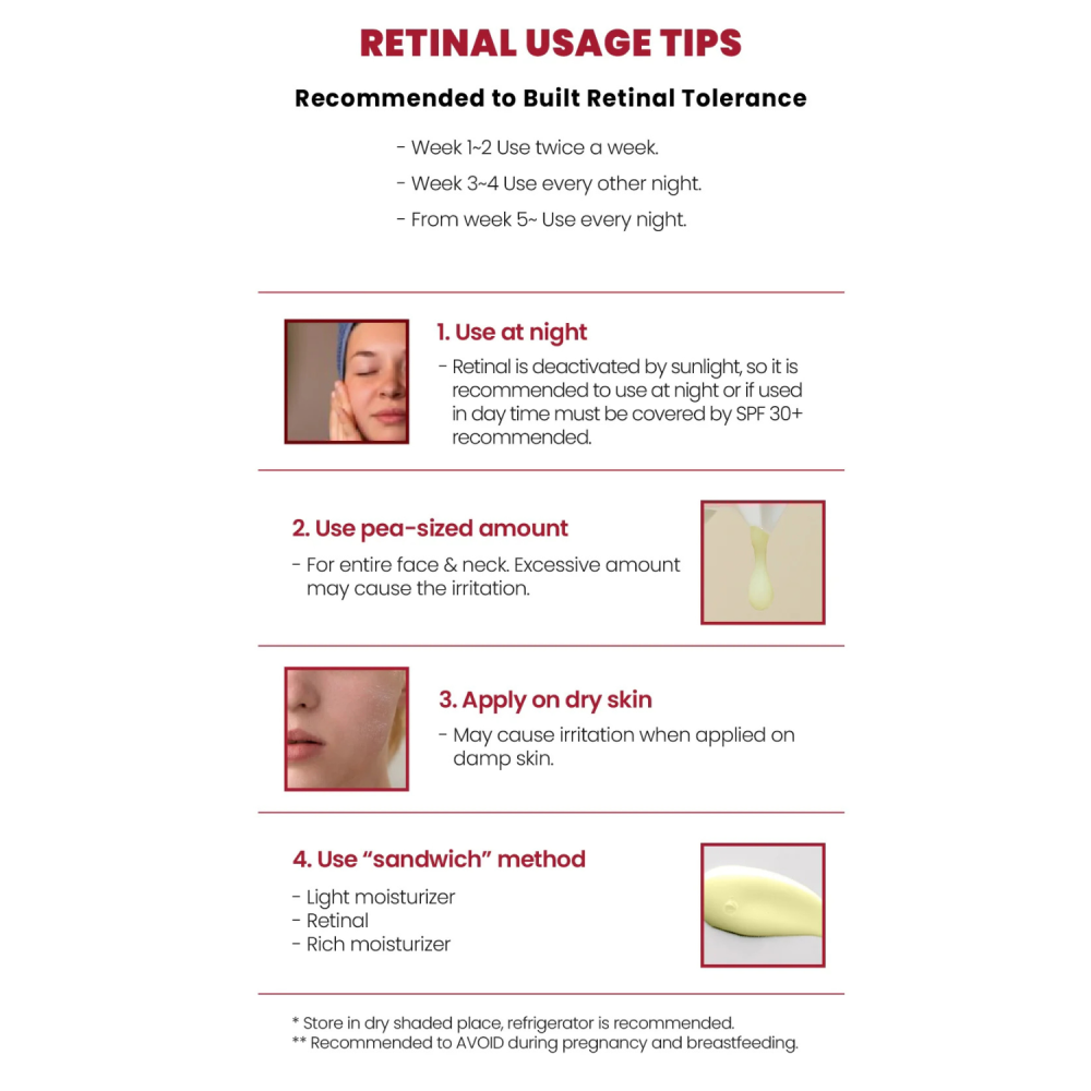Modo d’uso: Applicare una piccola quantità su pelle detersa come ultimo step della skincare serale. Massaggiare delicatamente fino a completo assorbimento. Si consiglia di iniziare con applicazioni alternate (1 giorno sì, 1 no) per valutare la tolleranza. Non usare durante la gravidanza o l’allattamento. Durante il giorno applicare sempre una protezione solare SPF 50+.