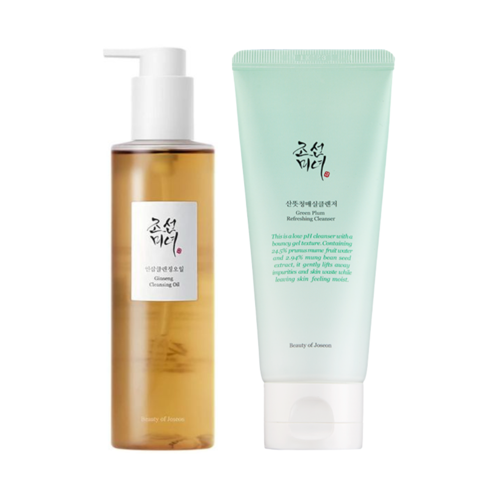 Routine di doppia detersione con due best seller Beauty of Joseon: olio detergente al ginseng e gel rinfrescante alla prugna verde. Perfetta per rimuovere trucco, sebo e impurità lasciando la pelle morbida, pulita e luminosa.