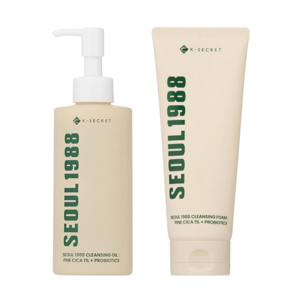 Routine di doppia detersione con olio e schiuma purificante KSECRET Seoul 1988. Deterge in profondità, lenisce la pelle sensibile e riequilibra la barriera cutanea grazie alla Pine Cica 1% e ai probiotici.