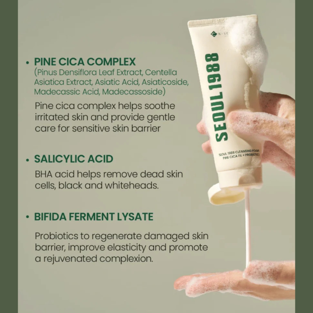 Seoul 1988 Cleansing Foam, sempre arricchito con Pine Cica 1%, probiotici e acido salicilico, completa la detersione eliminando le impurità residue dai pori. Ha un’azione purificante ma delicata, lasciando la pelle rinfrescata, equilibrata e piacevolmente lenita.