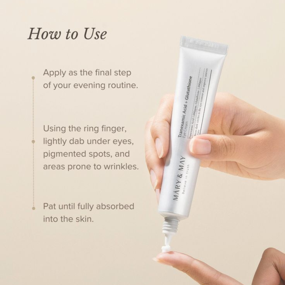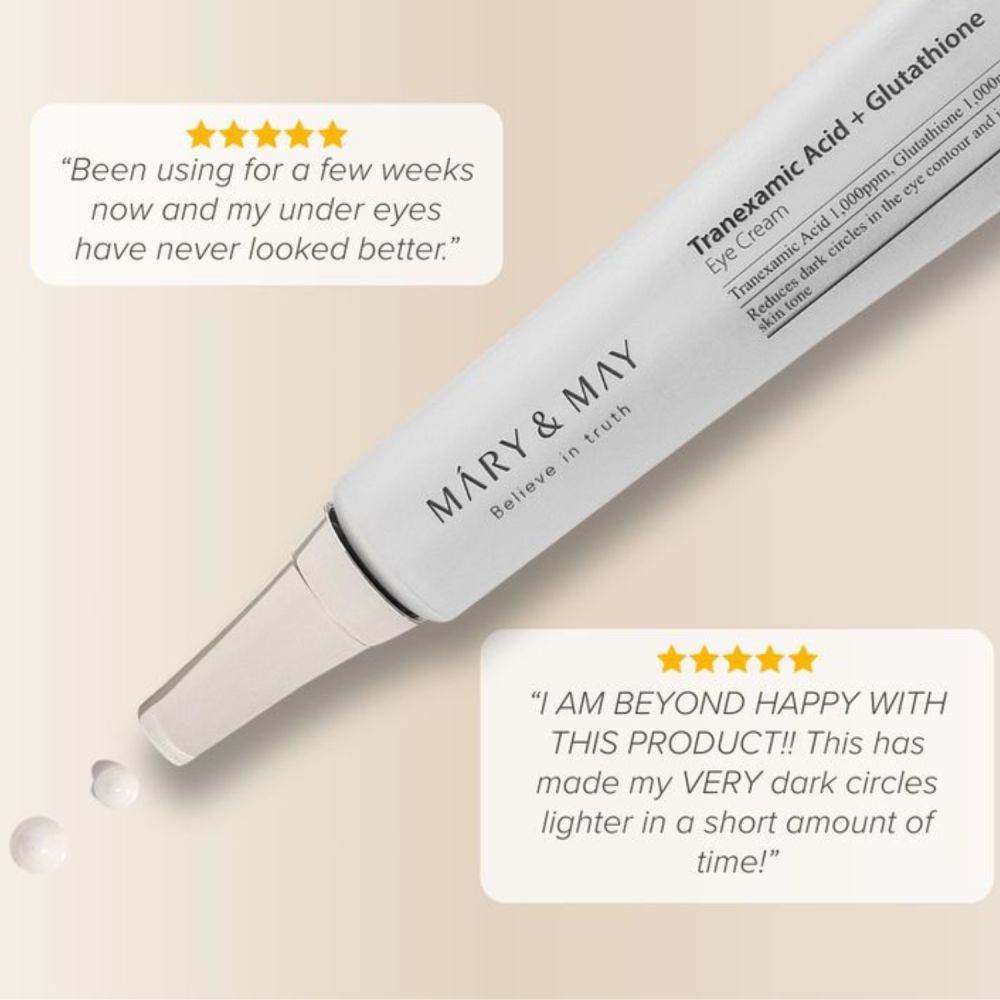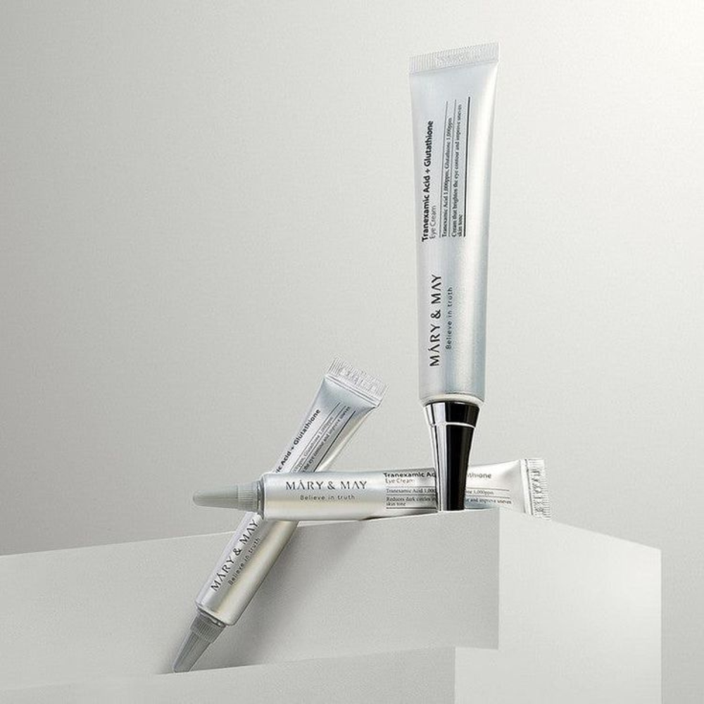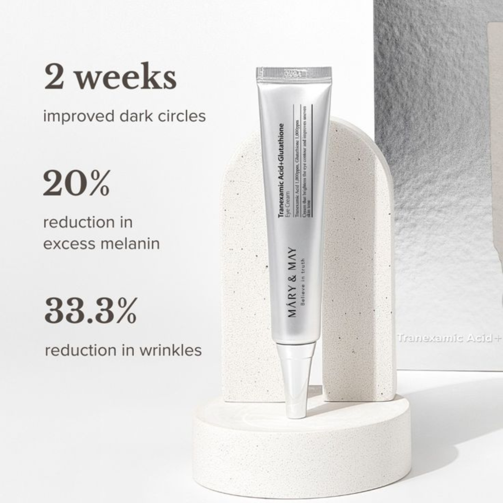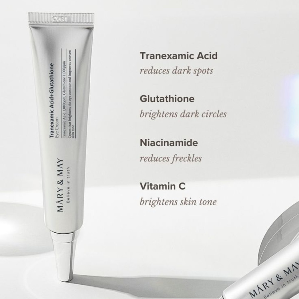 Tranexamic Acid + Glutathion Eye Cream di Mary&May è una crema contorno occhi ad azione mirata contro stanchezza, discromie e perdita di tono. La sua formula avanzata combina ingredienti schiarenti, antiossidanti e idratanti per donare uno sguardo più luminoso e riposato.