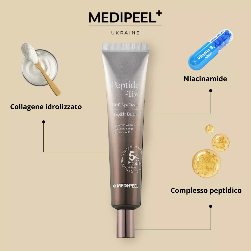 Medi-Peel Peptide Bor Tox Eye Cream è una crema contorno occhi con peptidi effetto botox e collagene che aiuta a ridurre rughe, gonfiore e perdita di elasticità, donando uno sguardo più compatto e levigato.
