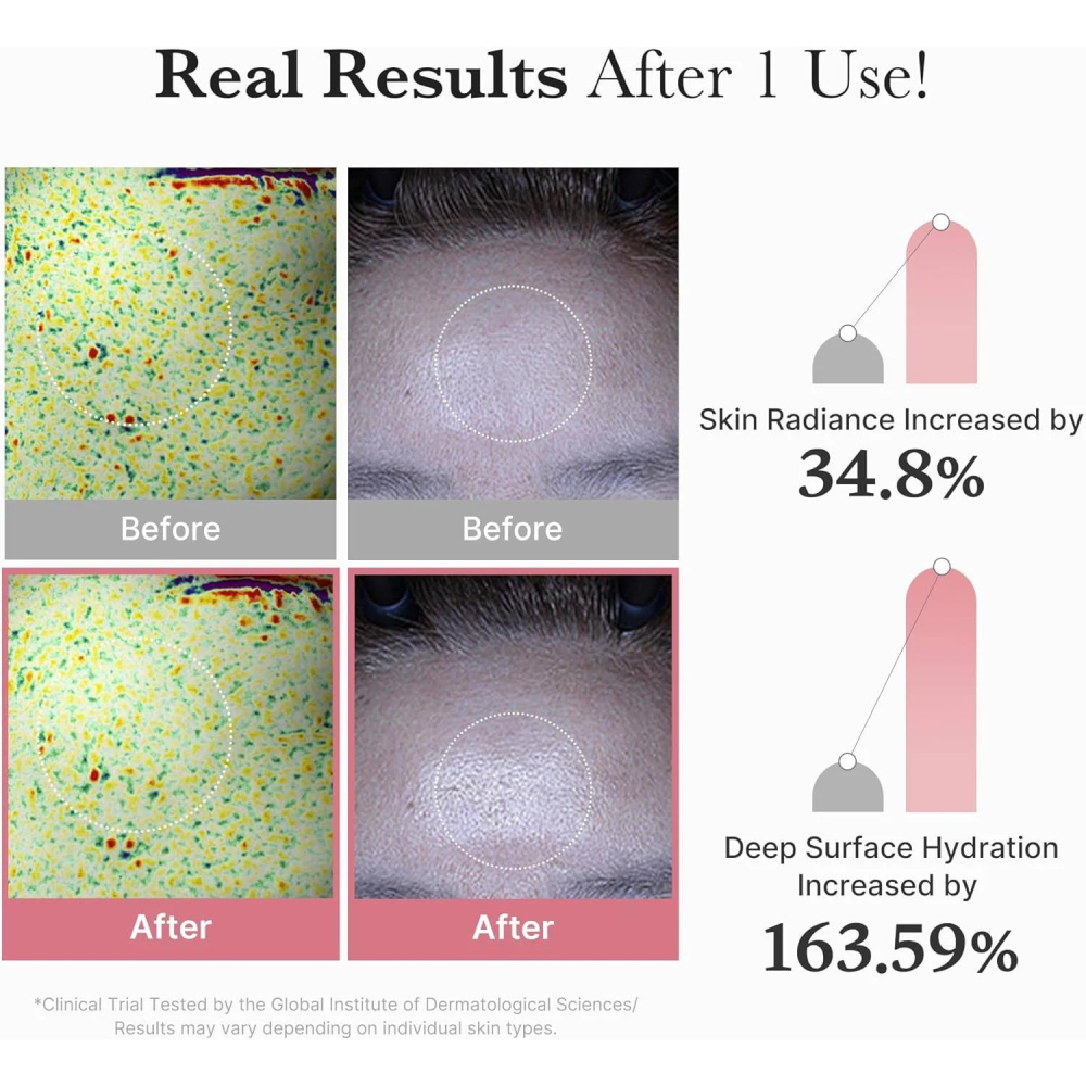 Questa maschera offre anche benefici visibili già dopo pochi utilizzi, contribuendo a ridurre rossori, migliorare la luminosità e attenuare macchie e imperfezioni. La pelle appare più idratata, liscia e radiosa, con un effetto glow immediato. La formula ipoallergenica la rende adatta anche alle pelli sensibili.