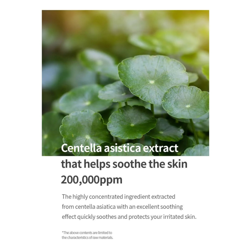Ingredienti (INCI): Water, Centella Asiatica Extract, Butylene Glycol, Glycerin, 1,2-Hexanediol, Hydroxyacetophenone, Xanthan Gum, Sodium Carbomer, Hydroxyethylcellulose, Ethylhexylglycerin, Disodium EDTA.