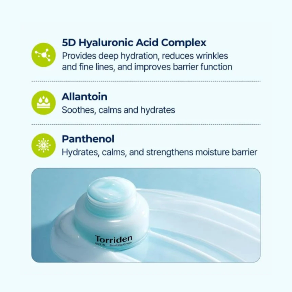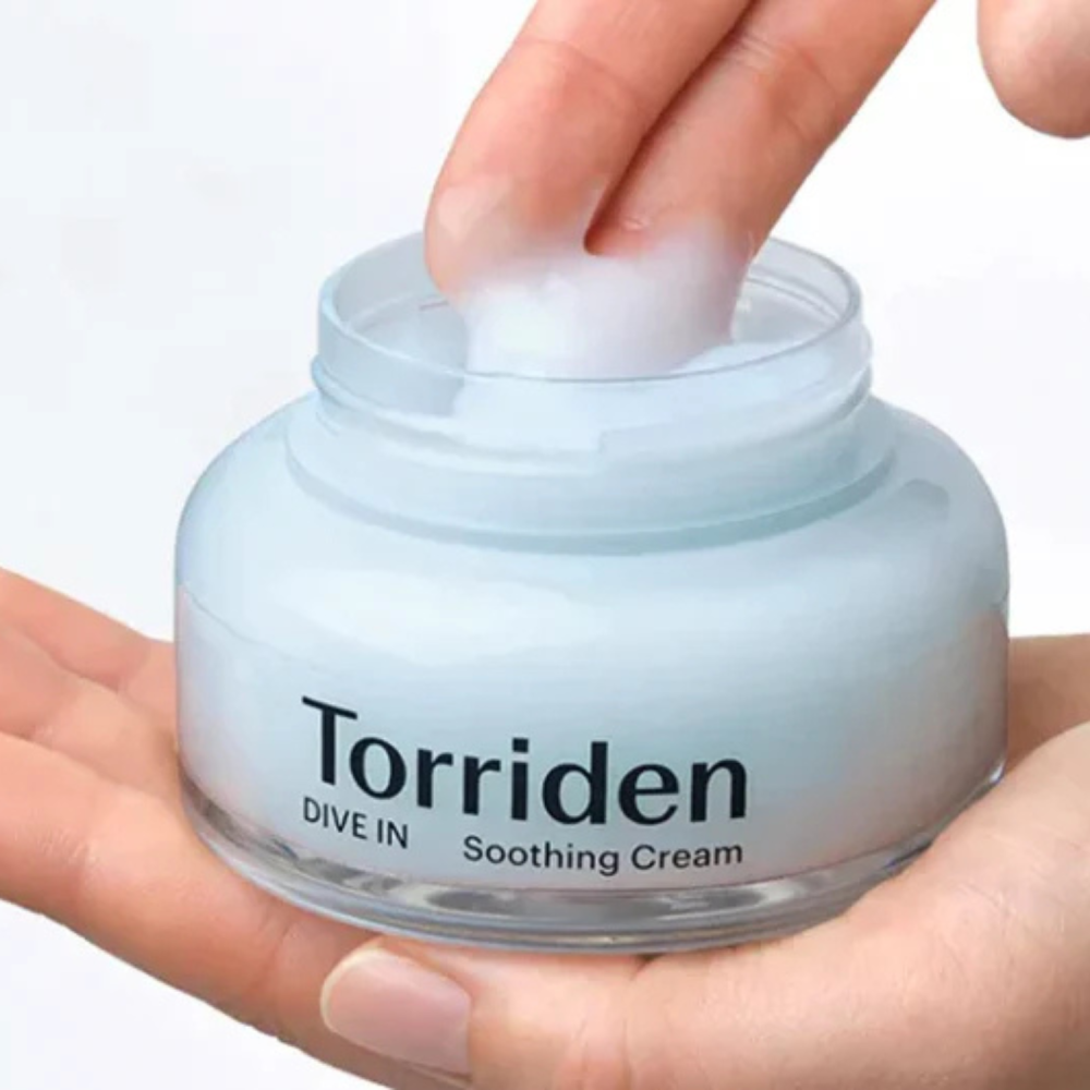 Torriden DIVE-IN Soothing Cream è una crema gel leggera con Acido Ialuronico a basso peso molecolare (5D-Complex). Lenisce immediatamente, riduce rossori e garantisce un’idratazione profonda e duratura. Ideale per pelli sensibili e oleose.